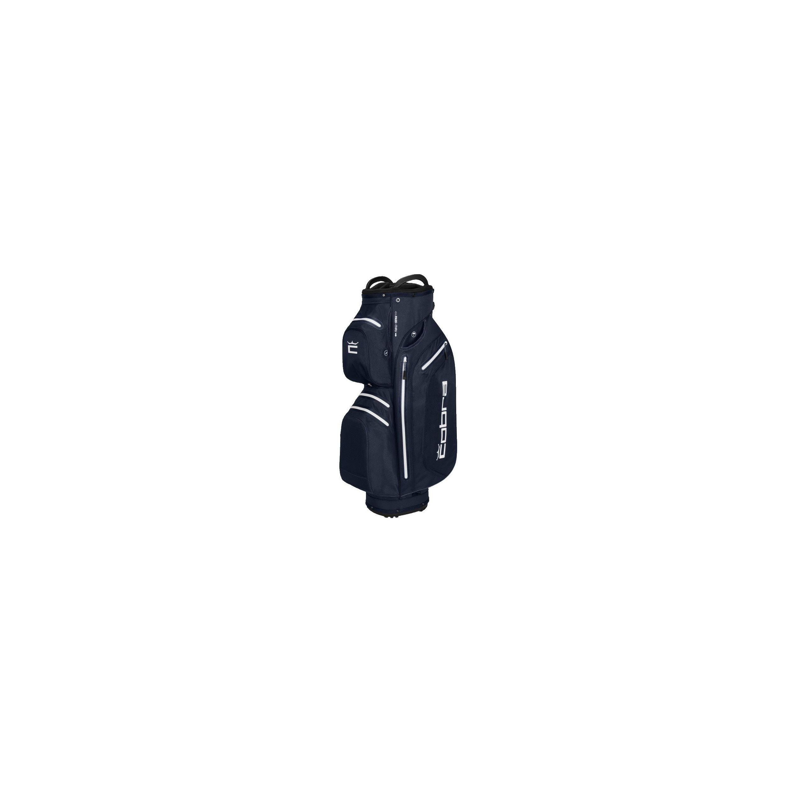 La bolsa para carrito Cobra Ultradry Pro es totalmente impermeable y cuenta con bolsillos con costuras selladas para proteger tus palos y pertenencias. Su parte superior de 14 compartimentos con divisores completos y un compartimento para putter permite una organización perfecta y evita que los palos se amontonen. Cuenta con siete bolsillos en total, incluyendo dos bolsillos extragrandes para ropa, un bolsillo aislante para bebidas y un bolsillo para objetos de valor con forro polar. La bolsa para carrito Cobra Ultradry Pro cuenta con un sistema de paso de correa para carrito que permite sujetarla a un carrito sin restringir el acceso a los bolsillos.